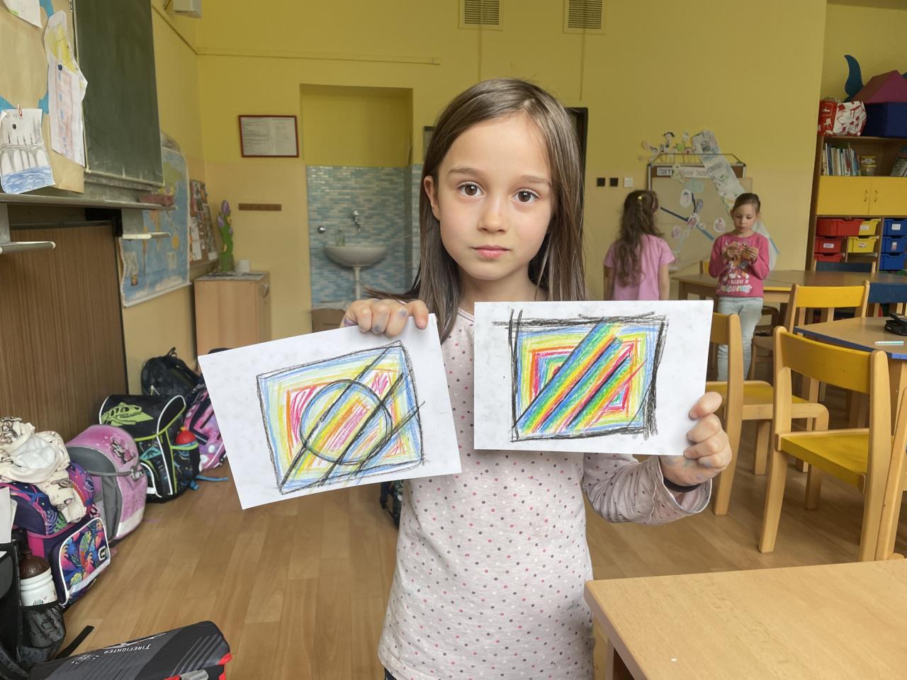 Již víme, že v tomto druhu umění nekreslíme kočičky, domy nebo lidi přímo, ale spíš jak si je představíme pocitově. Když zavřeme oči, jak vidíme barevně a pohybově hudbu, náladu nebo třeba vítr.