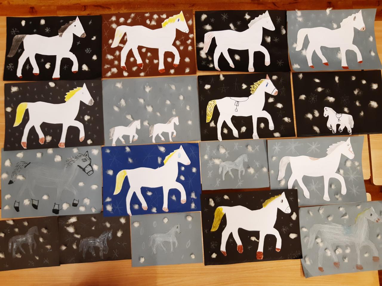 Svatý Martin přijel na bílém koni jen o týden později a přinesl nám začátek zimy. A tak jsme si koně s dětmi nakreslily, vystřihly a sníh vyrobily z vaty.