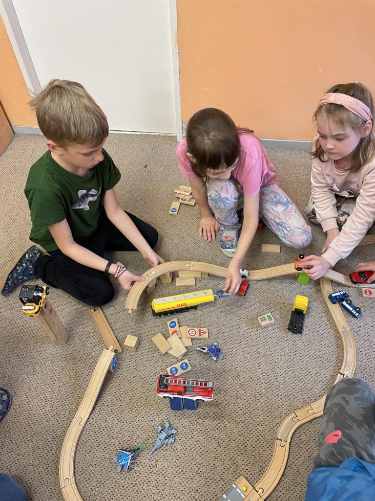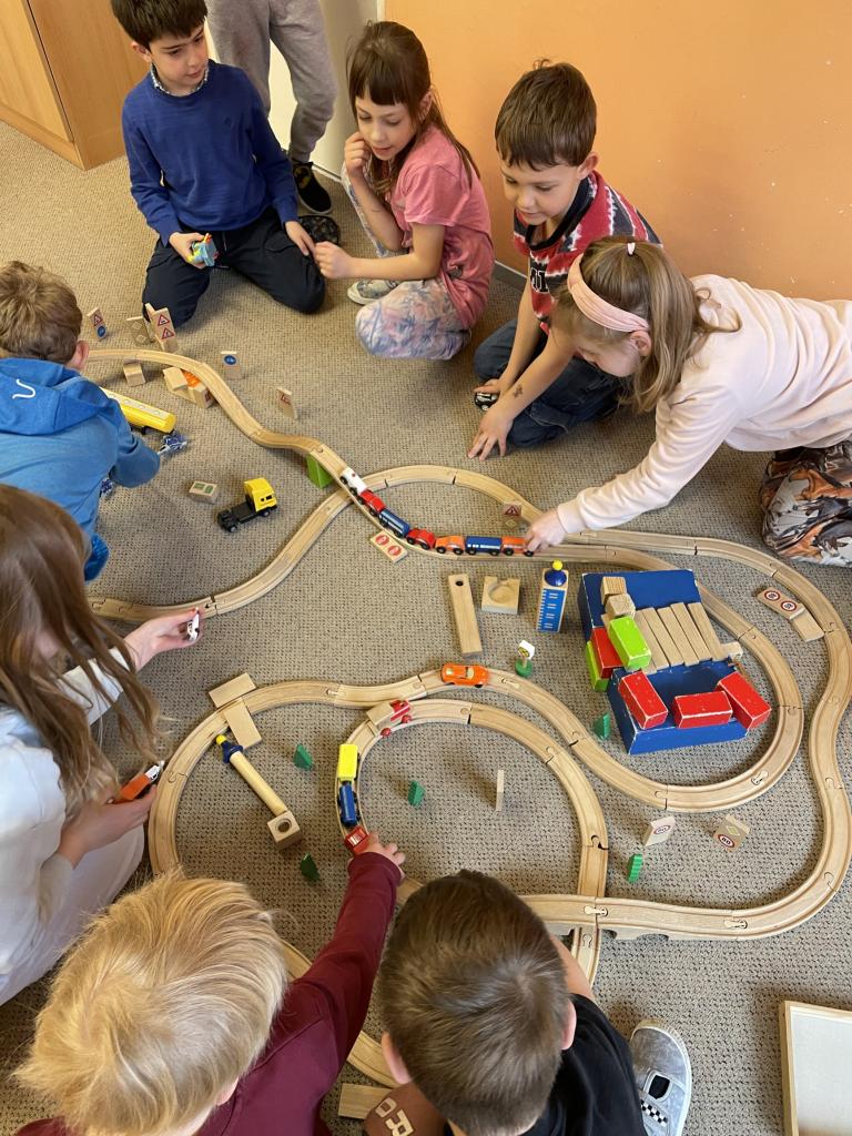 Pak jsme si postavili městský okruh s dopravním značením a do něj pustili auta, lidi a vlaky, náklaďáky.