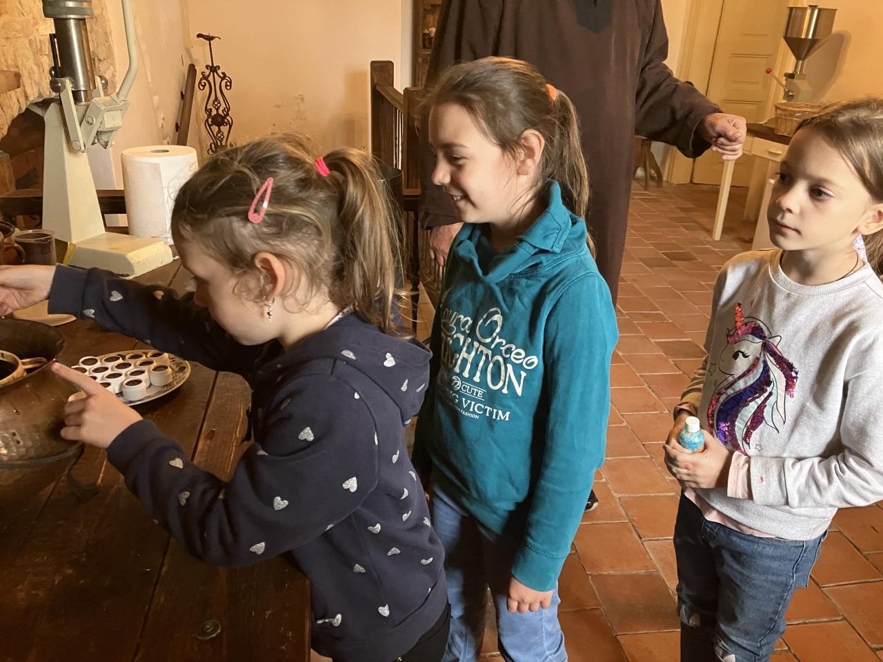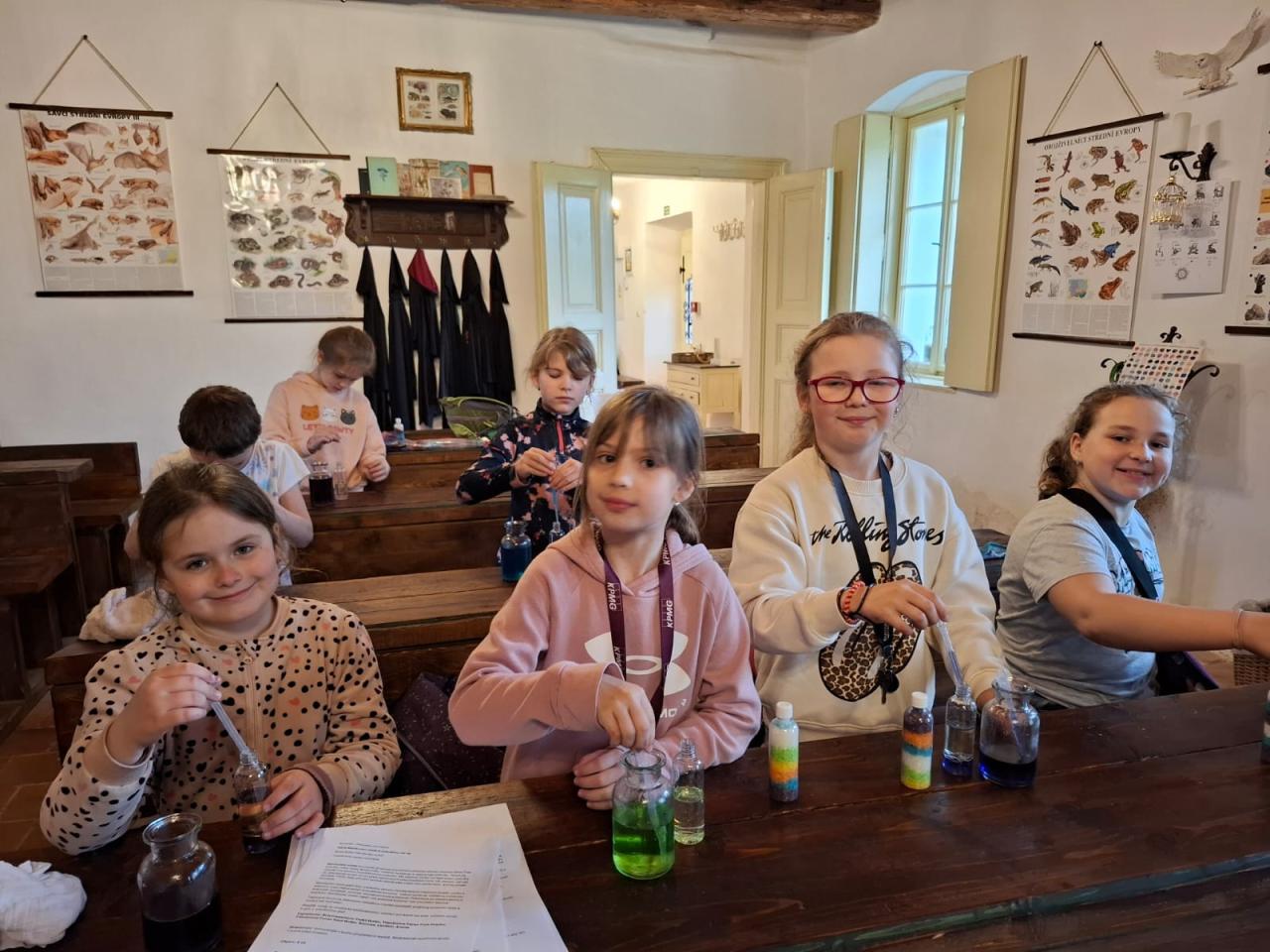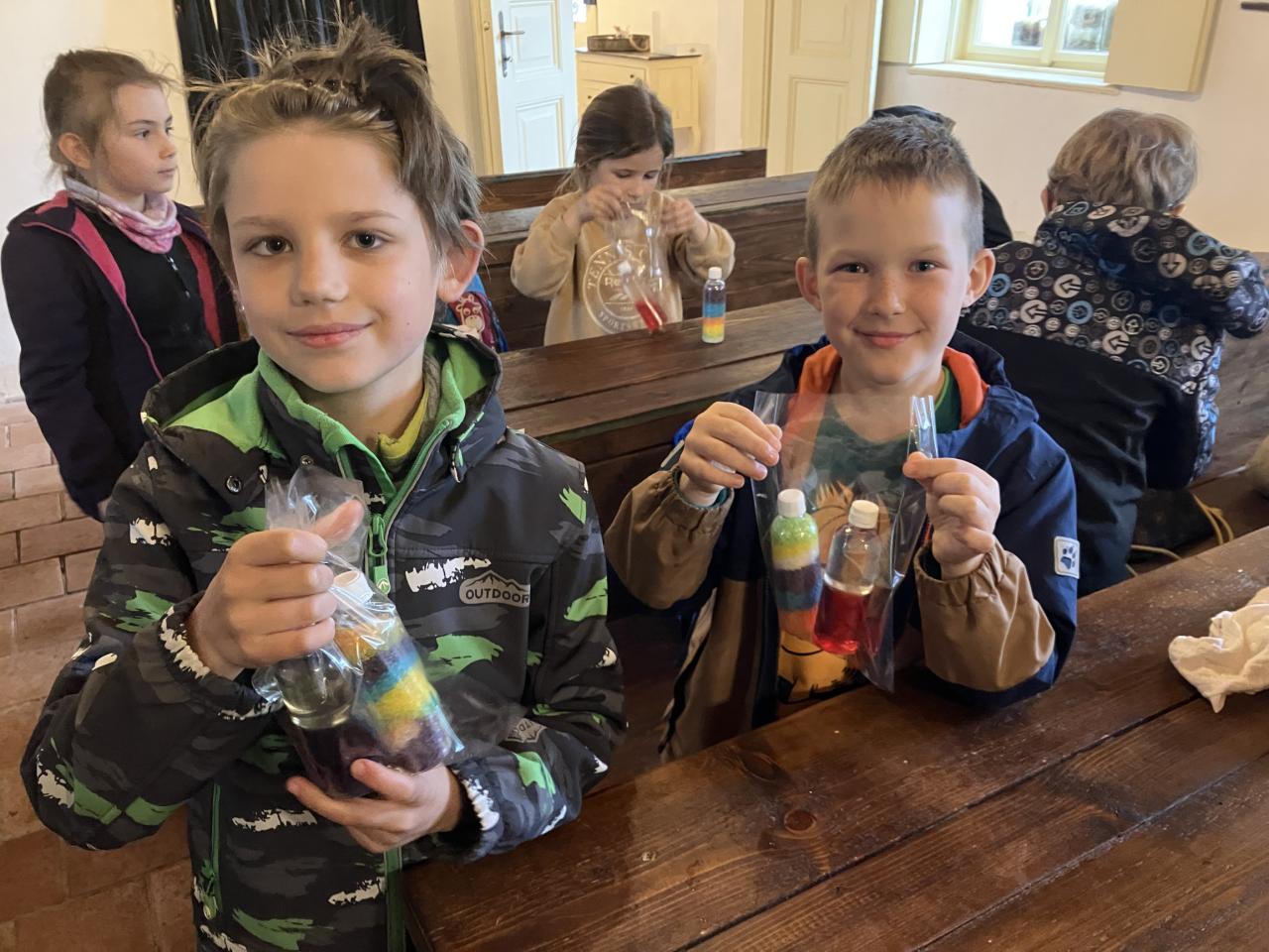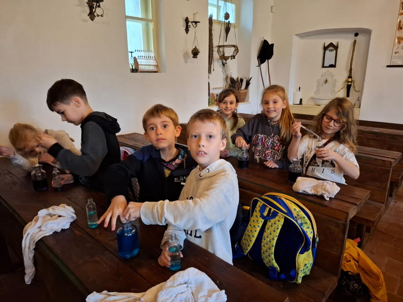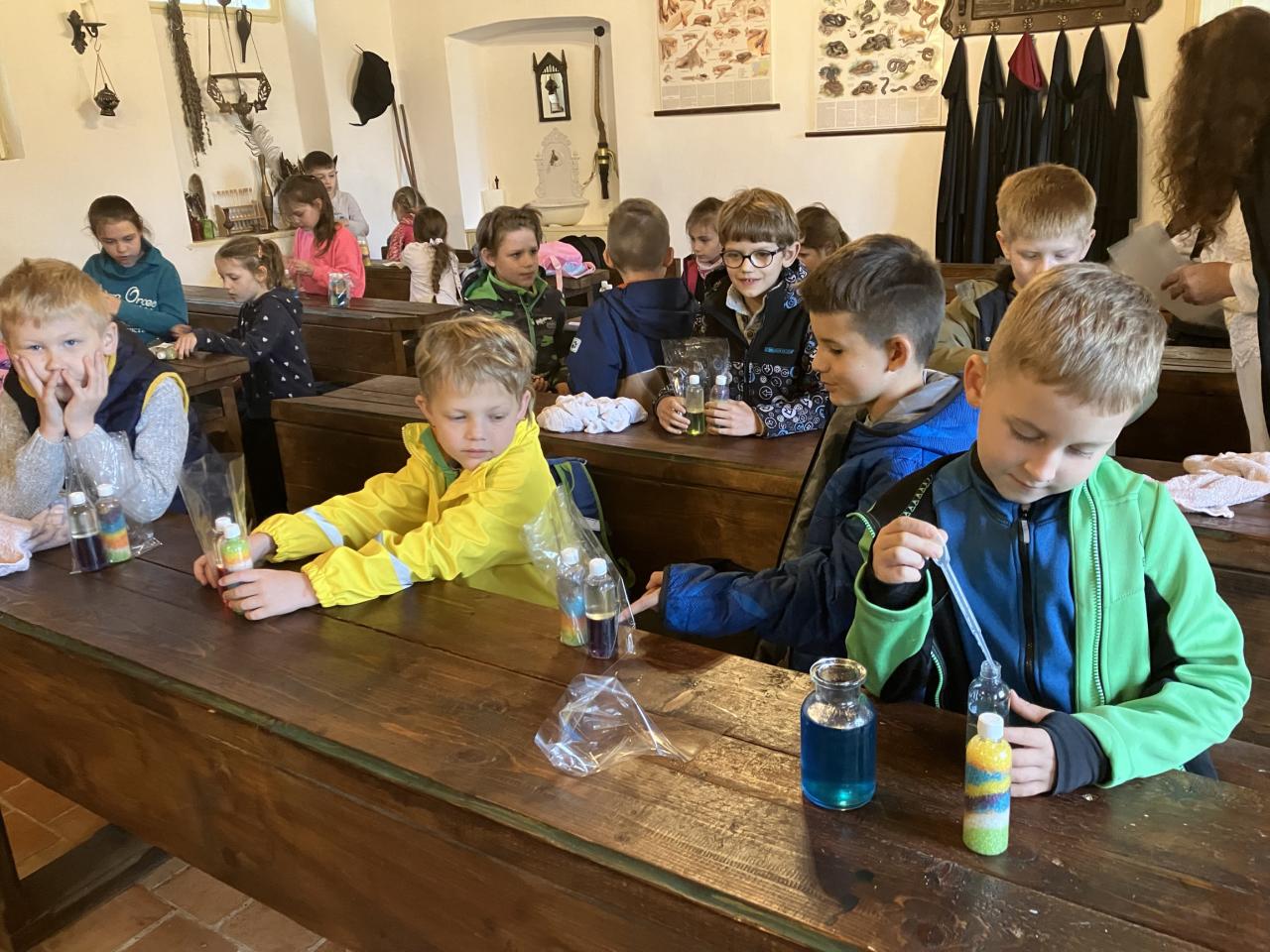 Zde jsme v alchymistické dílně míchali léčivé lektvary. Následovalo plnění lahviček koupelovou mořskou solí. Nakonec si děti zkusily vyrobit perníčky starou metodou vytlačování do forem z lipového dřeva. Perníčky se povedly, snad zbylo na ochutnání i rodičům. (TRO)
