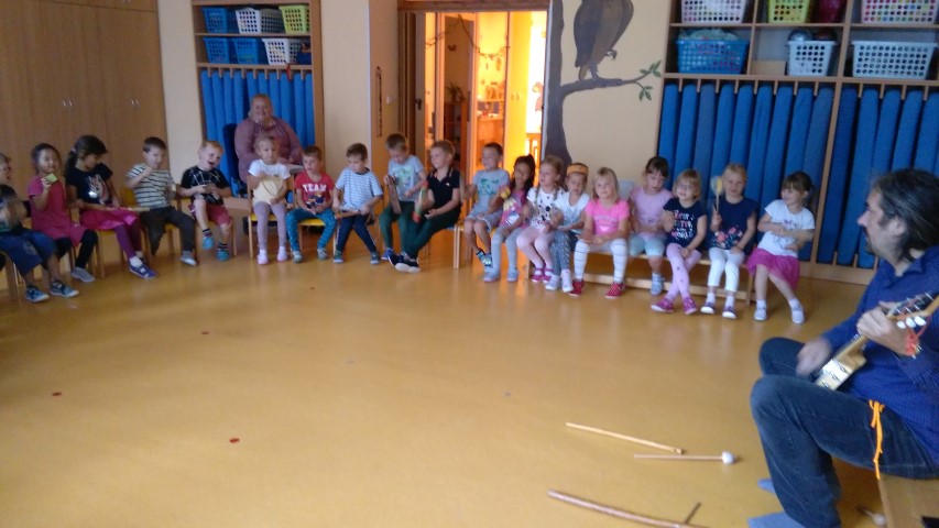 Ve čtvrtek 24.9. nám přišel pan Vrba povědět pohádku o tom, Jak šel buben do světa. K tomu hrál na banjo, my jsme mohli hrát s ním na různé alternativní nástroje, zpívali jsme a chvílemi i tančili. A tím jsme i my pomohli, aby buben zase našel šťastně cestu domů.