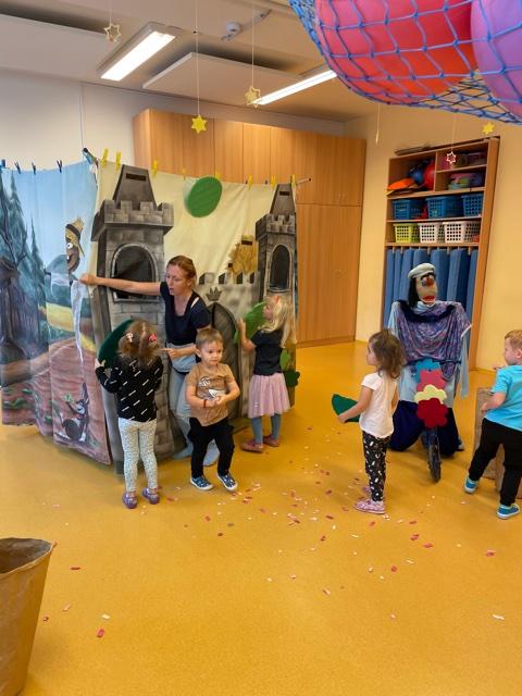 23. 9. přijelo do mateřské školy Divadýlko z pytlíčku s pohádkovou komedií Královna barev.