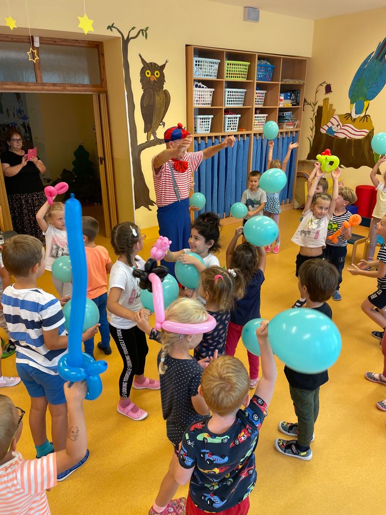 Už ve čtvrtek 9.9. nás přišel pobavit klaun Pepíno se svými psími kamarády a kamarádkou Vlastou, která uměla vykouzlit z nafouknutých žížalek krásné dárečky v podobě zvířátek. Pepíno nám ukázal i rozcvičku s pejsky a spoustu jiných legrácek. Nakonec jsme si všichni dohromady zatancovali.