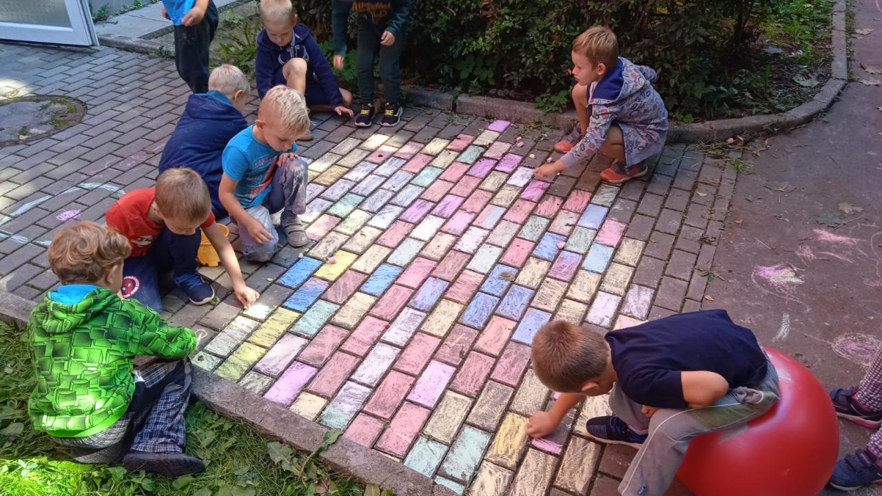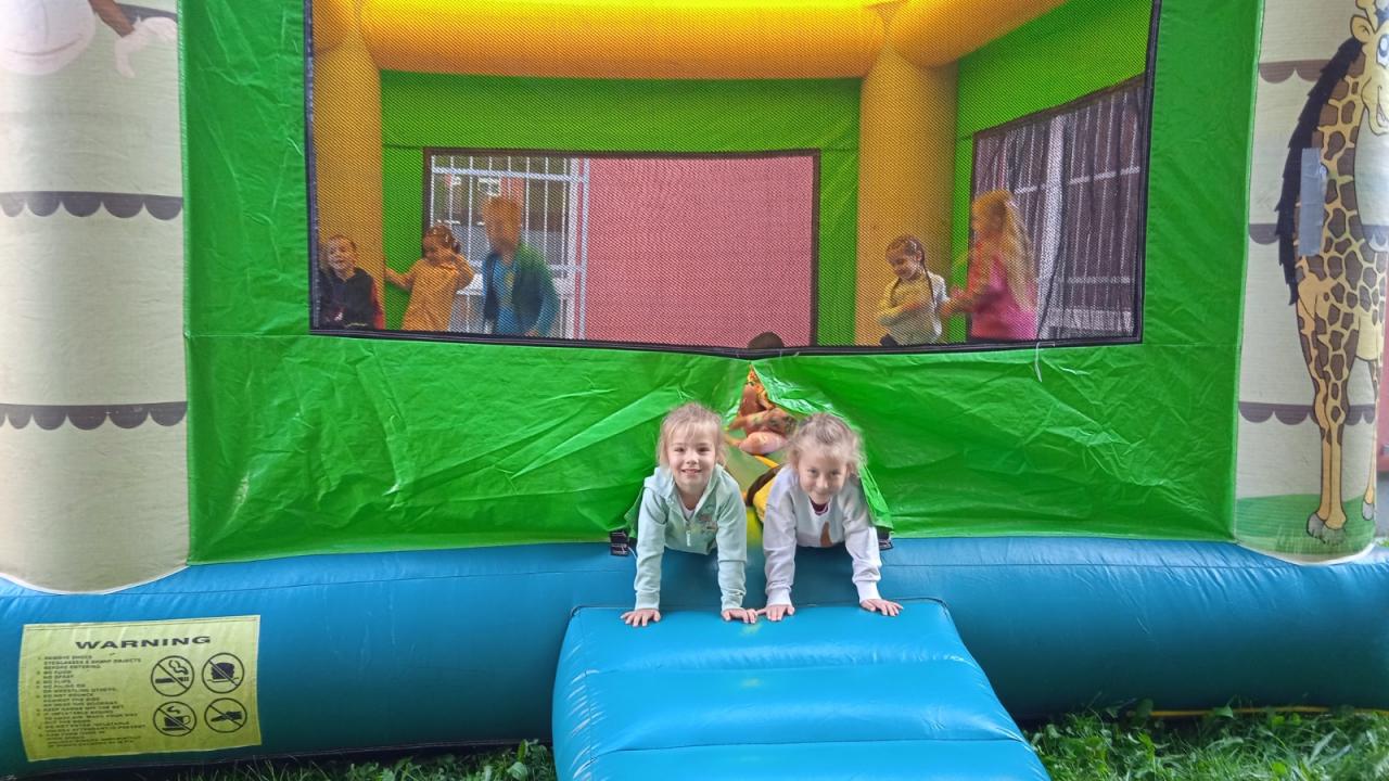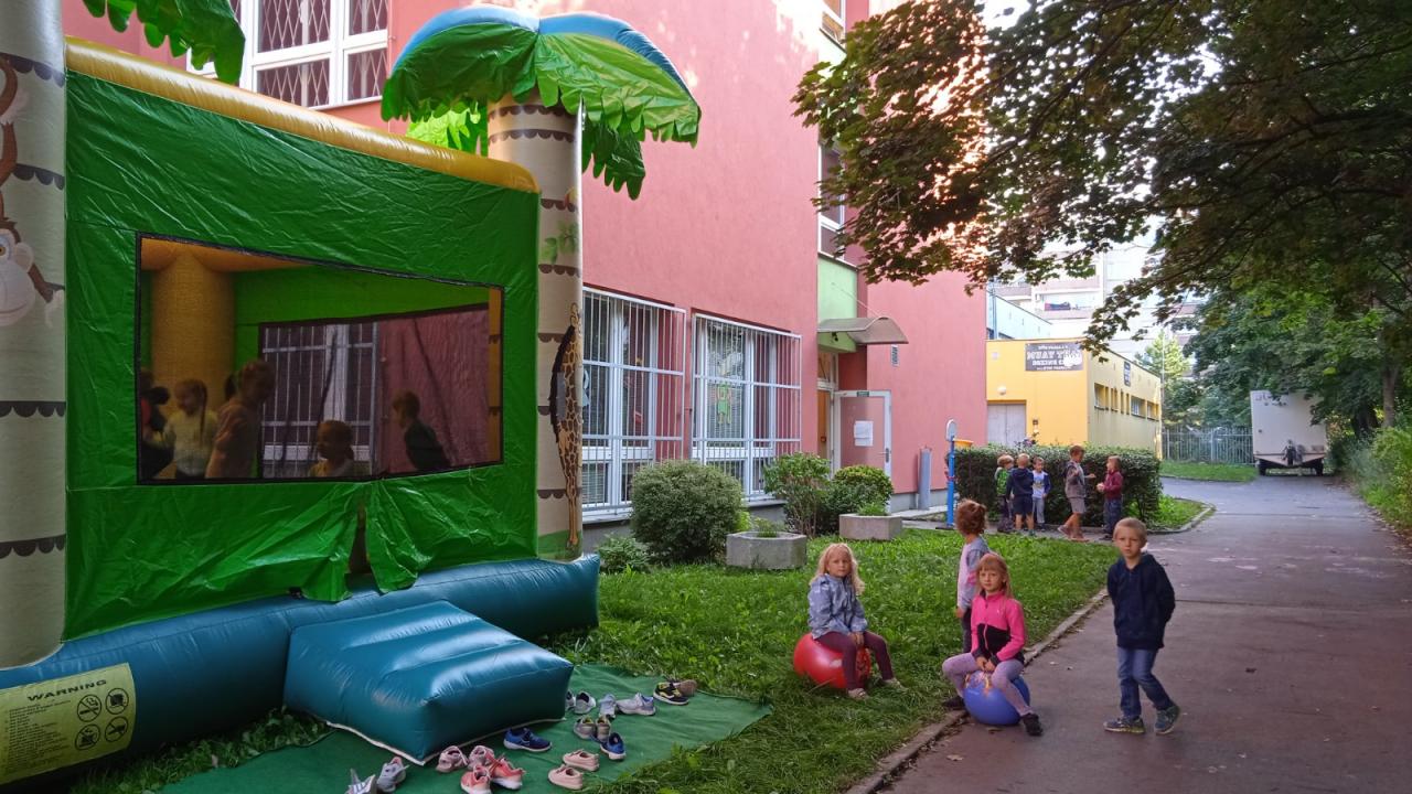V úterý 14.9. se nám před školkou nafouknul skákací hrad a my se mohli pořádně vydovádět. Kdo zrovna neskákal v hradu, mohl skákat na balónu, házet míč na basketbalový koš, trenovat s obručí nebo kreslit křídami na chodník a tím ho krásně ozdobit.