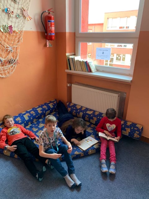 Koutek se hned zalíbil a děti už si knihami listují. Vedle stolního fotbálku, který máme ve druhém patře naší školy, je to další relaxační aktivita na přestávky. Koutky budeme dále zútulňovat a knihy průběžně doplňovat.