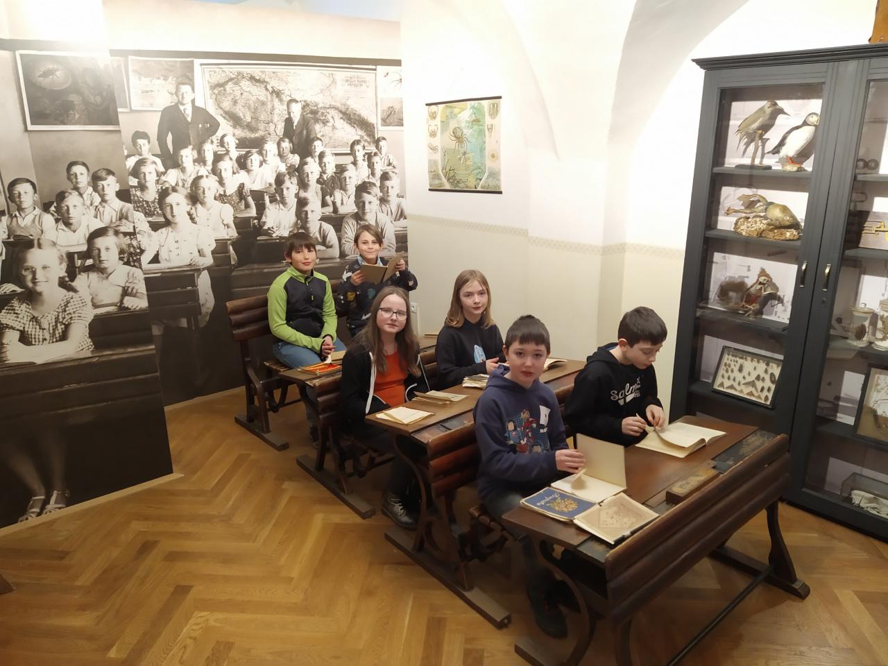 Dostali jsme pracovní sešity s úkoly a po celém muzeu jsme hledali odpovědi na různé otázky. Také jsme si vyzkoušeli jak se sedělo ve starých lavicích s kalamářem psalo husím brkem. Odnesli jsme si spoustu nových poznatků. (HOL, RÝZ, JEB, LID)